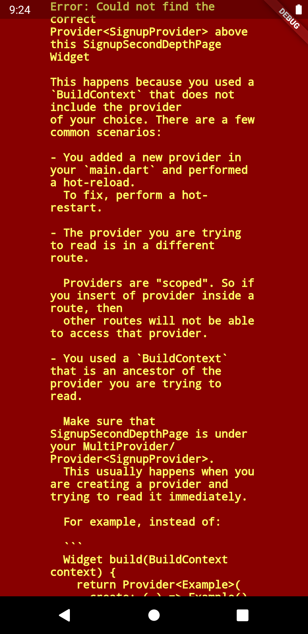 MaterialApp에서 routes를 설정하여 Navigation을 잘 이용하고 있었다. Provider와 같이 이용하고 있었는데 회원가입할 때 정보를 여러 페이지로 나누어서 입력을 받아 회원가입을 진행하는 것으로 되었다. sigup_first_page와 signup_second_page가 있을 때 sigup_first_page에서 signup_provider를 생성하여 사용하니 signup_first_page에서 Navigaion으로 second페이지로 이동 후 해당 provider를 사용하려고 하니 아래와 같은 에러가 발생하였다.